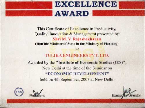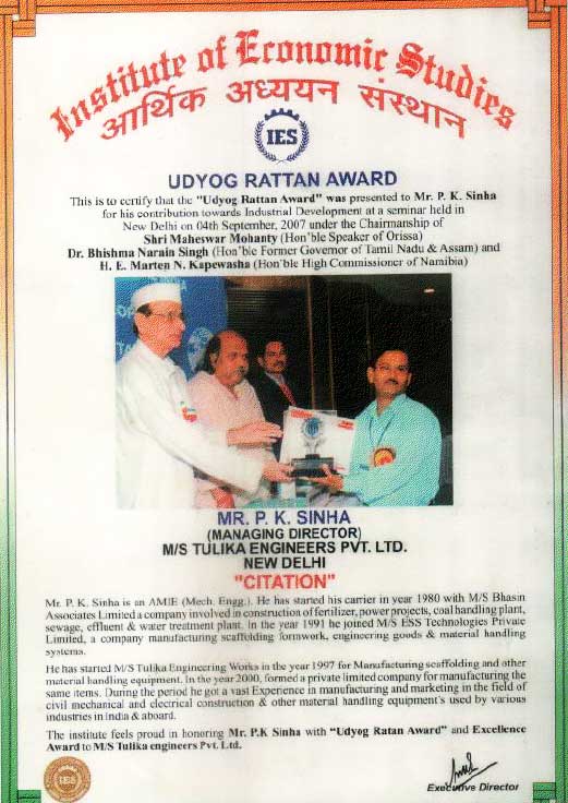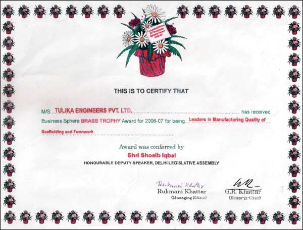Tulika Engineers Private Limited has got Business Sphere Award 2006, for leader in manufacturing quality of scaffolding & frame work